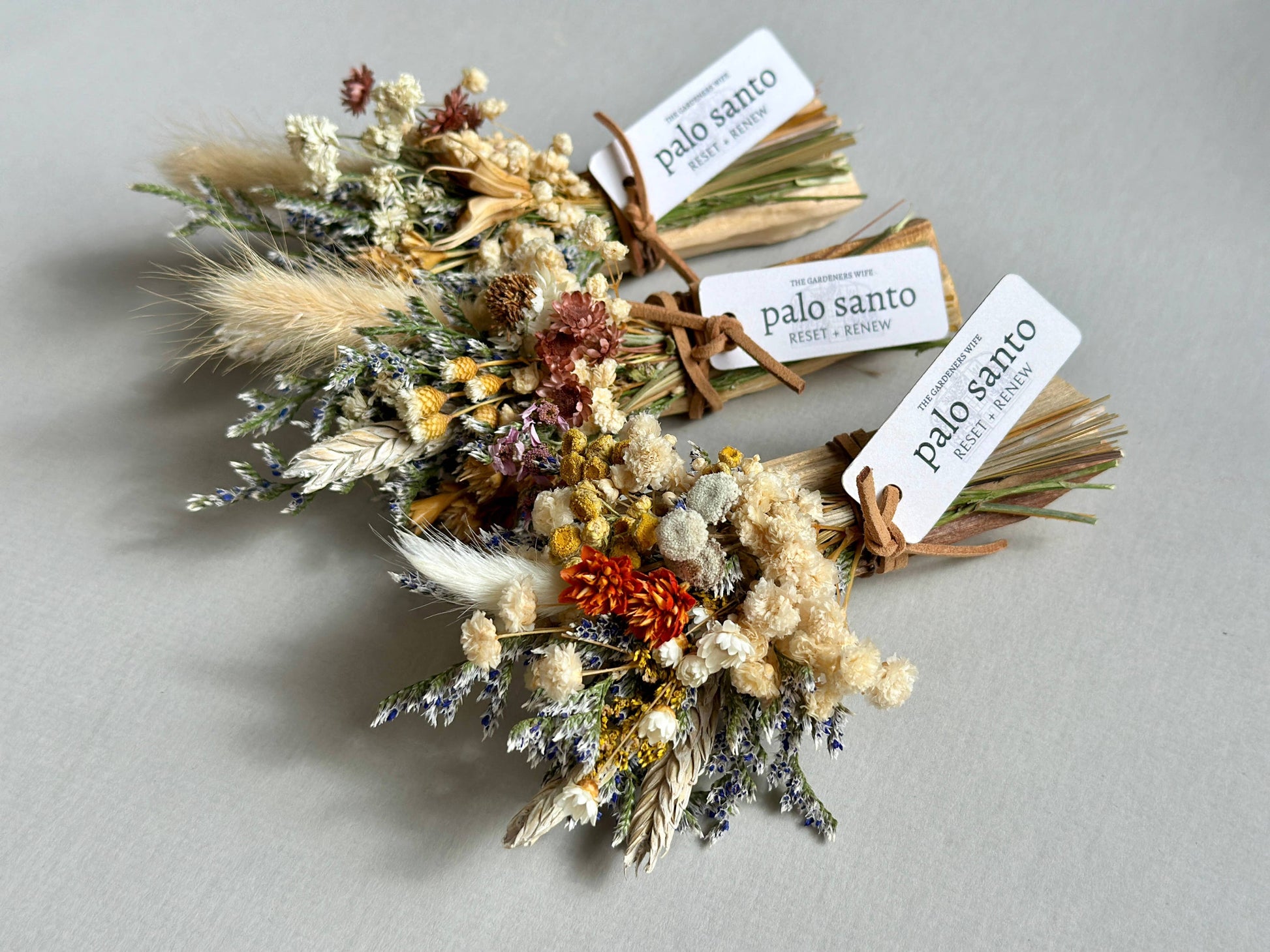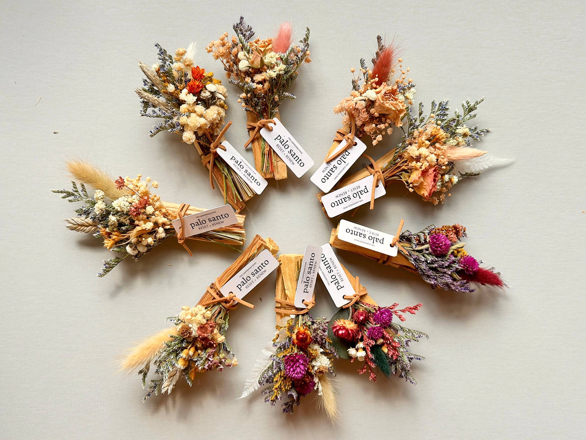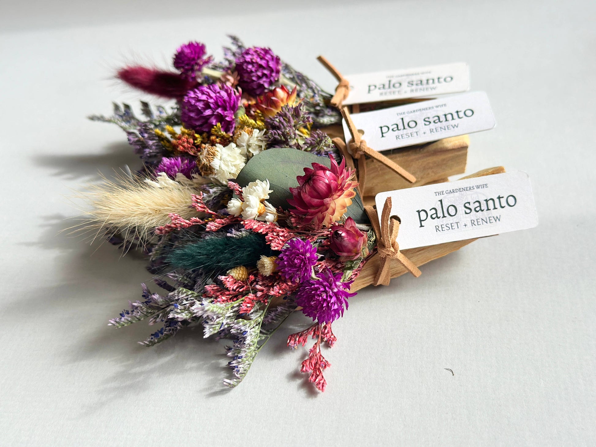 Palo Santo is sourced ethically, from family run farms in Ecuador. This bundle comes with a single stick of Palo Santo, and a tiny arrangement of forever flowers. Bouquets are made with flowers that have been dried, dyed and preserved, and will always be seasonal/slightly different than pictured.
