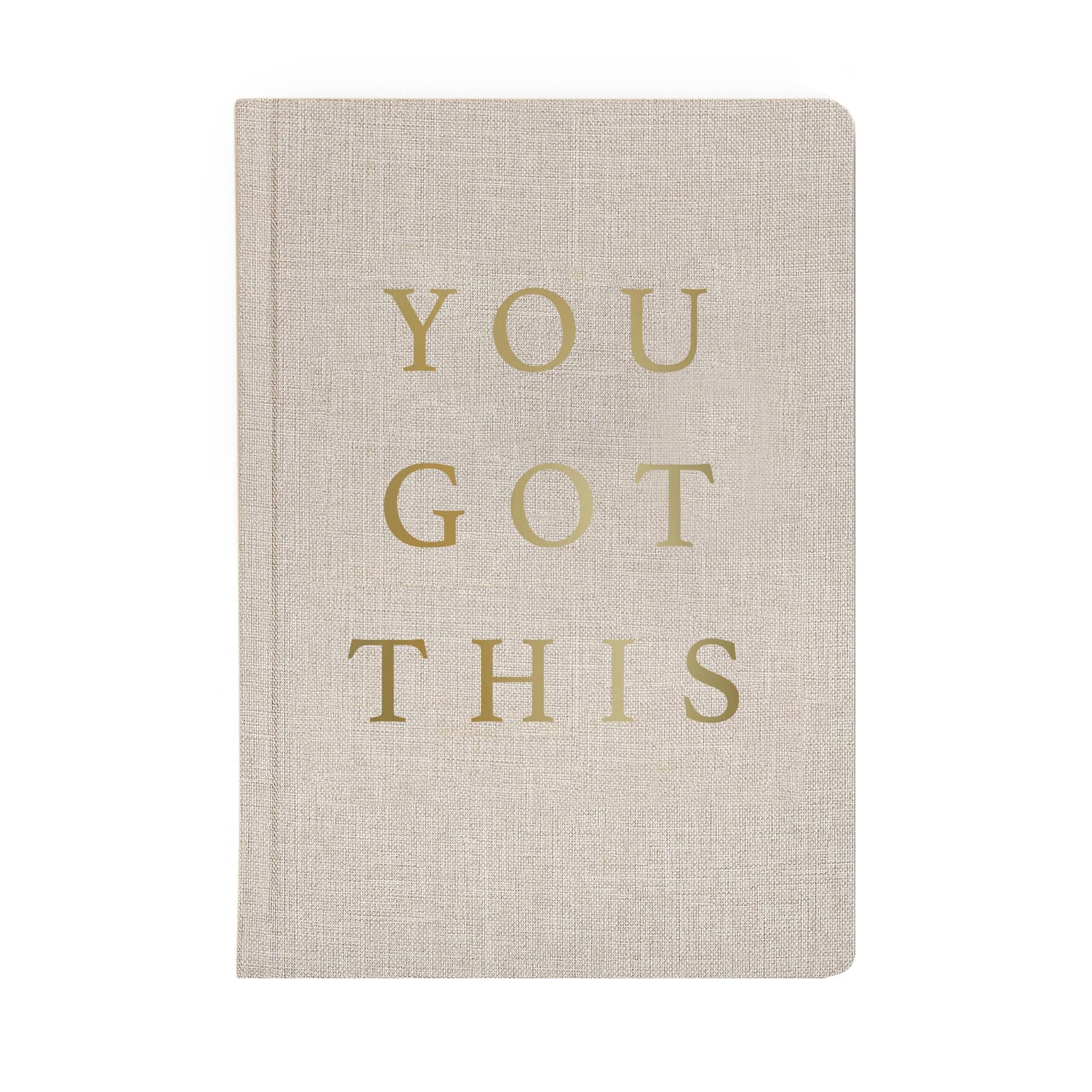 DETAILS: • Size: 8.1 x 5.6 x 0.6” • Design: You Got This • Tan Fabric Journal with Gold Foil Details • 100gsm Uncoated Lined Paper • Ribbon Bookmark in Gold • 100 Pages Front and Back (200 Total) • Designed in the USA, Imported